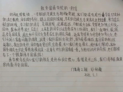 身在海外,心系祖国!williamhill英国官网在国外做交换生的两位同学16英语2班刘嘉莹和17英语2班邓科敏也联系了学校,她们都写了一封信拍了视频表达对祖国与天院领导老师和同学们的祝福。即使她们身在异国,但她们的心是紧系祖国的!