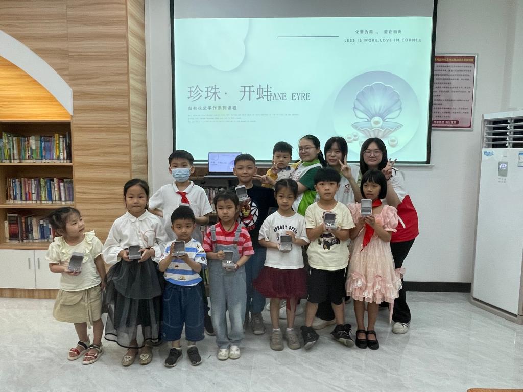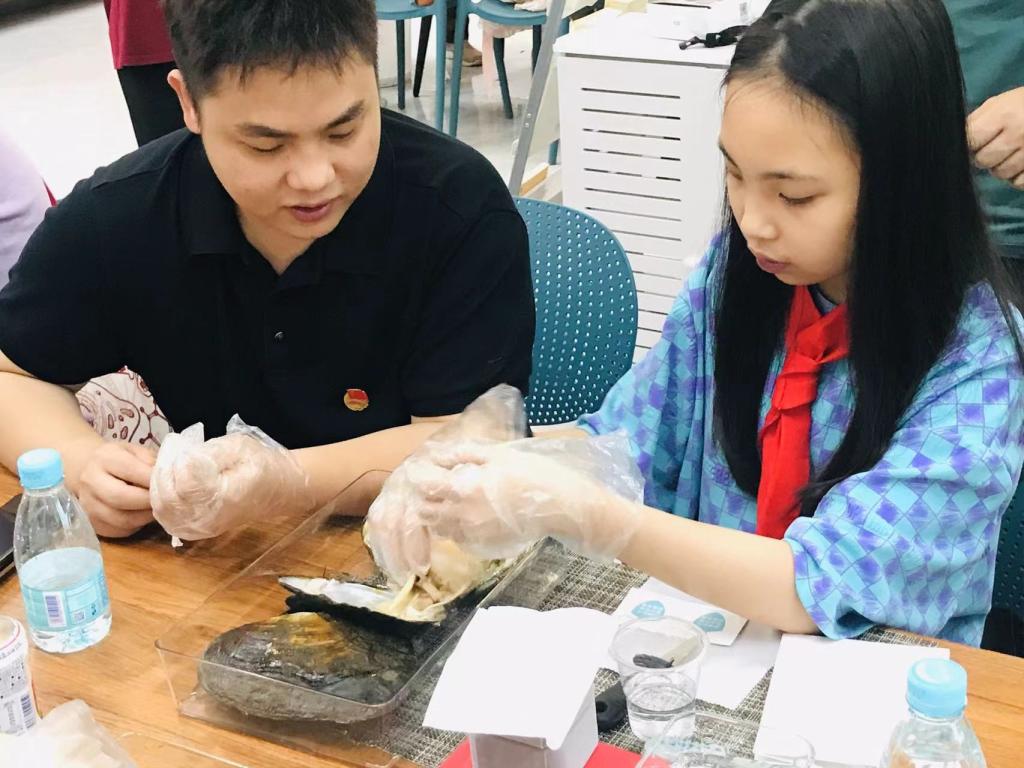 活动过程中,工艺师带领大家一起开蚌取珠。我院志愿者在旁给予帮助和解说。在经历选蚌、开蚌、挖珠、清洗等一系列的步骤后,大家得到了许多晶莹剔透的珍珠。珍珠的形态有大有小,尽显光泽。在工艺师的指导和志愿者们的协助下,大家选取了自己喜欢的耳环、项链或胸针,将开出的珍珠清洗后并打孔镶嵌到饰品上,制作完成了属于自己的独特饰品。制作完成后,小朋友们围成一团,满怀欣喜地展示着自己的成品。活动现场充满着轻松愉悦。