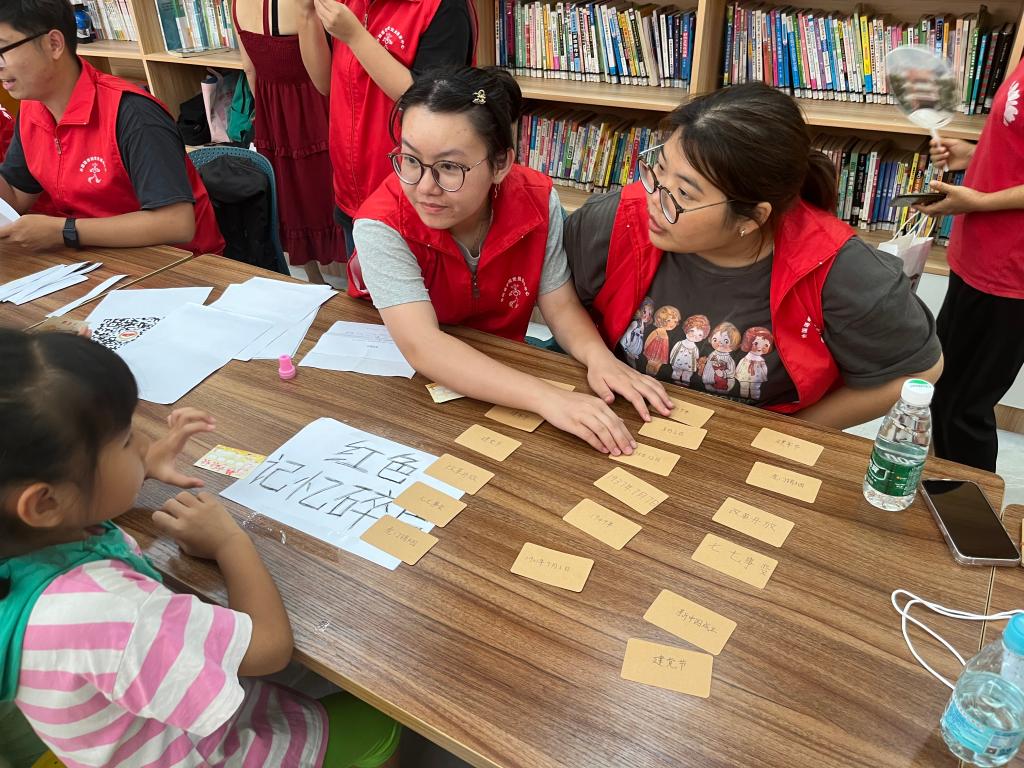 到达图书馆后,我院暑期社会实践团队成员明确各自的分工和责任,有条不紊地布置活动现场,整齐摆放好物资,布置好座椅板凳,等待家长及学生的到来。此次宣传活动采用线上线下相结合的方式,线上通过实时直播对外宣传,线上观看直播人数累计约1200人,现场到场人数约为200人。在宣传活动过程中,我院暑期社会实践团队成员热情地接待每一位家长和学生,耐心细致地解答家长们的问题,组织大家有序参与活动。活动游戏分时段进行,上半场为历史知识问答、你划我猜、雷区采水;下半场为看图猜成语、红色记忆碎片、红歌大合唱。红色文化宣传活动将历史知识融入游戏中,以任务、关卡等形式引导参与者进行探索和学习,增加趣味性和参与感,加深对历史事件的印象以及增进对优秀人物事迹的了解,同时引导家长和学生缅怀历史,悼念先烈,进一步增强爱国信念。最后大家通过合唱红歌的形式增强民族自信心与民族自豪感。