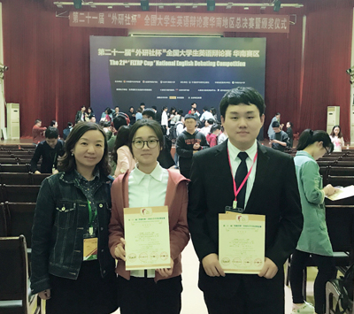 3月23日 至25日,第二十一届“外研社杯”全国大学生英语辩论赛华南赛区总决赛在华南农业大学举行。我校williamhill英国官网罗清、黄军洁同学在指导老师沈悦英的带领下,与来自12个省市的101支高校代表队竞争,经过3天5轮比赛考验,辩手们凭借出色的临场发挥,娴熟的辩论语言技巧,灵活的思辨能力,最终荣获华南赛区三等奖。