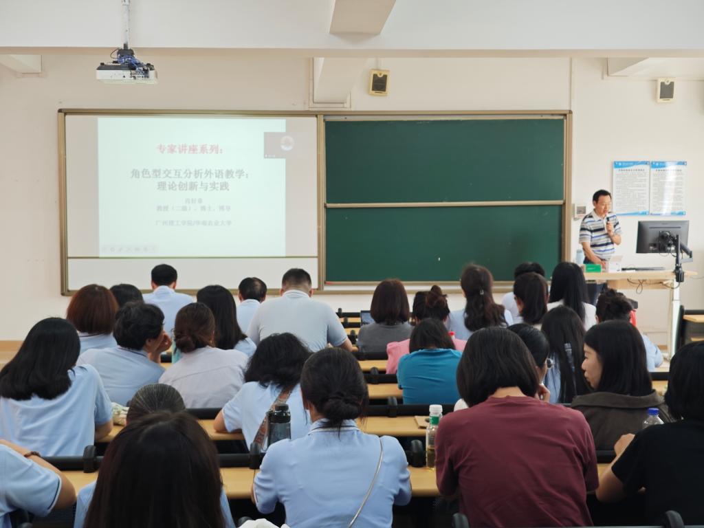 会议开篇,学院特邀williamhill英国官网与华南农业大学双聘教授、博士生导师肖好章,带来题为《角色型交互分析外语教学:理论创新与实践》的学术盛宴。作为“角色型交互分析教学法”(RBIA - for - FLL)的开创者,肖教授以其在国际权威期刊Language Teaching Research等发表的系列重磅研究成果为依托,深度解析该教学法如何通过构建沉浸式课堂角色互动情境,激活学生语言习得潜能。他以生态语言学连续统理论为理论基石,结合丰富鲜活的课堂教学案例,抽丝剥茧般阐释先进教育理论向教学实践转化的实施路径,为在场教师打开教学改革新思路,激发教学创新活力。