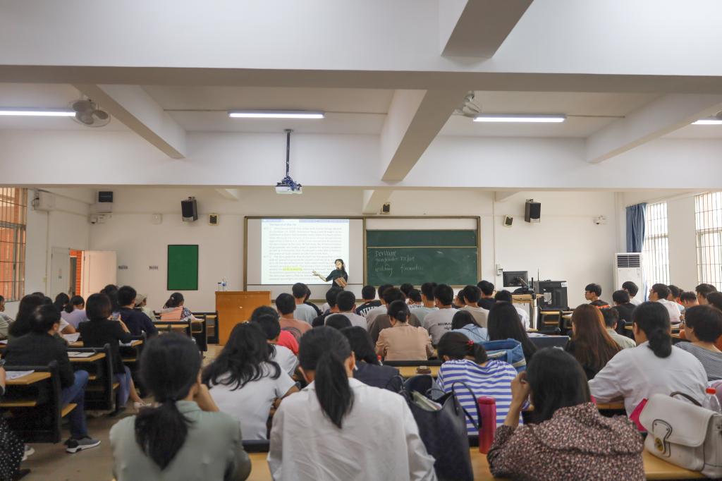 示范课上,王雨晗老师选取《全新版大学进阶英语综合教程 第2册 》---Unit 5 Pioneers of Flight为教学内容。在课文阅读环节中,王老师结合本课阅读技巧训练“概括中心思想”,引导学生通过寻找文章关键词和概括课文段落大意。学生掌握阅读技巧的同时能更好地理解文章内容和主旨。随后王雨晗老师针对文本进行针对性的提问:The details of Wan hu’s story? The relation between Wan hu and modern aviation? 通过英语合成构词法,王老师带领同学们用科学高效的方法来理解、记忆单词。例如:animals eat meat(动物吃肉),动词eat后加ing,进而变为meat-eating animals(吃肉的动物),旨在引领学生在探究中体验,在体验中探究,充分调动学生的学习主动性。最后通过师生共同探究学习环节,学生对课文的理解更加透彻,达到了本节课的情感培养目标。