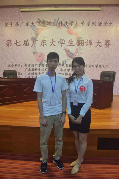 此次翻译大赛由共青团广东省委员会、广东省教育厅、广东省科学技术厅、广东省科学技术协会、广东省学生联合会主办,广东财经大学、广东省翻译协会承办,是一次面向全省各级高校的高水平翻译赛事。全省89所高校的601名学生参与角逐,最终26人进入口译决赛,39人进入笔译决赛,刘成莉和徐文清同学不畏强手,沉着应对,顺利进入口笔译决赛,并在决赛中冷静发挥,发挥出了真实水平,为学校赢得了荣誉。