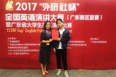 冯蔼莹荣获2017年全国英语演讲大赛广东赛区三等奖