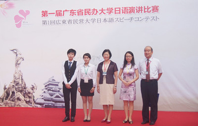 广东省民办大学首届日语演讲比赛是为落实广东省2014年“强校工程”工作精神,实现大学间协同创新,资源共享,提高日语专业学科建设水平而举办的一场权威的、专业的日语演讲赛事。本次比赛得到了日本驻广州总领事馆、日本好莱坞大学院大学、日本横滨商科大学、卡西欧公司的鼎力支持。来自广东省12所民办大学的25名日语佼佼者参加了紧张激烈的角逐。选手们扎实的日语功底,流利的口头表达和机智而不失幽默的临场反应,给在场的评委和观众留下了深刻的印象。这是我院第一年参加此类省级的日语演讲赛事,学生和指导老师都得到了很好的锻炼,积累了不少经验,为来年取得更好的成绩打下了坚实基础。