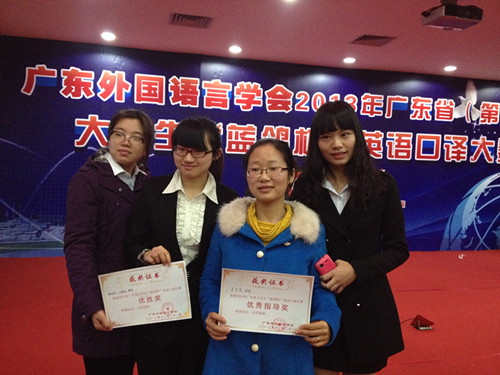 12月21日,由广东省外国语言学会主办的2013年广东省(第五届)大学生“蓝鸽杯”英语口译大赛在广州大学拉开帷幕,外语系大四年级学生杨启玲、熊莹,大三年级学生刘嘉莉在吴思思老师的指导下代表学院参赛,并荣获 “优胜奖”,吴思思老师荣获“优秀指导奖”。
