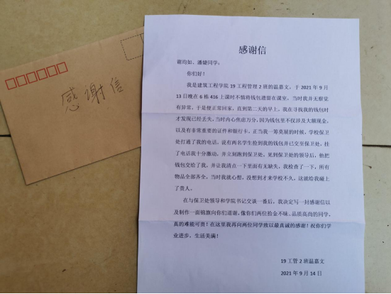 2021年9月14日早上,19翻译2班的谢均如和潘婕像往常来到6栋教学楼416上基础英语总论的课。正当低头完成英语听力练习时,谢均如突然发现隔壁座位下有个棕色的钱包,她捡起打开一看,发现里面有若干现金,以及银行卡、身份证等证件。当她捡到钱包的时候,她就想到失主一定很着急,环顾一周后发现失主并不是班上的同学,于是便和身旁的潘婕讨论如何将钱包交还给失主,经讨论后决定先告知任课老师并在下课时用麦克风询问是否有同学丢失钱包,询问无果后,潘婕提议上交到学校保卫处,经保卫处清点后发现钱包内有三千多的人民币以及一张一仟元整的澳门币,身份证社保卡及银行卡。谢均如和潘婕简单描述捡到钱包的经过以及登记后便将钱包上交等待学校处理以及失主认领。幸运的是,在当天下午书记及辅导员对两位同学进行事情经过的了解时便传来了失主已经找到了的好消息,经了解失主是建筑工程学院19工程管理2班的温嘉文同学,对于学校的高效以及钱包被认领,两位同学感到十分喜悦以及安心。