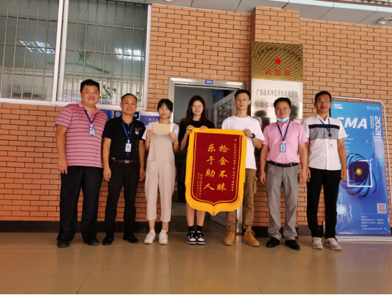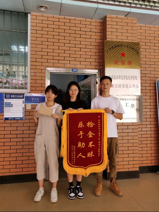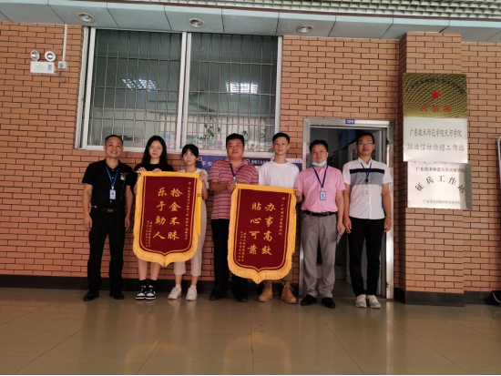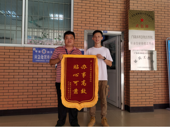9月17日中午,为了表扬两位同学的行为,广州理工williamhill英国官网以及建筑工程学院对两位同学的行为进行了表彰,并向两位同学颁发了失主送来的“拾金不昧 乐于助人”的锦旗,同时也向保卫处颁发了“办事高效 贴心可靠”的锦旗。