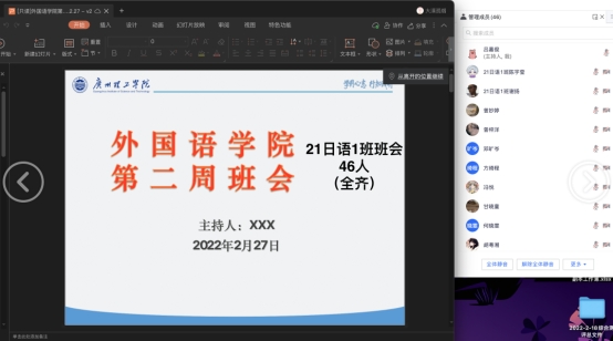 本次线上主题班会活动方式灵活,内容多样,实效性强。通过学习与交流,进一步强化了学生的规范行为和纪律意识,教育引导学生加强自我教育和自我管理,合理规划学习生活,履行作为当代大学生的责任担当,以崭新的精神风貌迎接疫情防控常态化下新学期的学习生活。