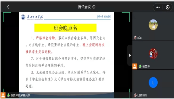 各班级积极响应,围绕学校疫情防控期间学生管理工作规定、大学生心理健康指导手册等内容,结合学院、专业特色及各年级学生特点,“量身定制”了一场场精彩的线上主题班会。有的班级组织学习《疫情防控期间学生管理工作规定》,强调返校后疫情防控常态化下的各项管理规定,深入讨论新时代大学生面对疫情如何践行社会责任;有的班级围绕《学生手册-修订版》开展疫情下的心理健康教育,帮助学业有困难、心理有压力的学生,化解思想困惑,做好心理疏导及人文关怀。班会结束后,各班还根据活动开展情况,从活动内容、参与情况、感想收获等方面进行总结,发挥良好宣传及教育作用。