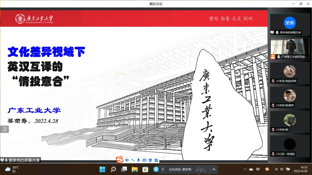 4月28日,我院特邀广东工业大学williamhill英国官网院长蔡荣寿教授于线上为我院全体学生开展了题为“文化差异视域下英汉互译的“情投意合”的学术讲座。