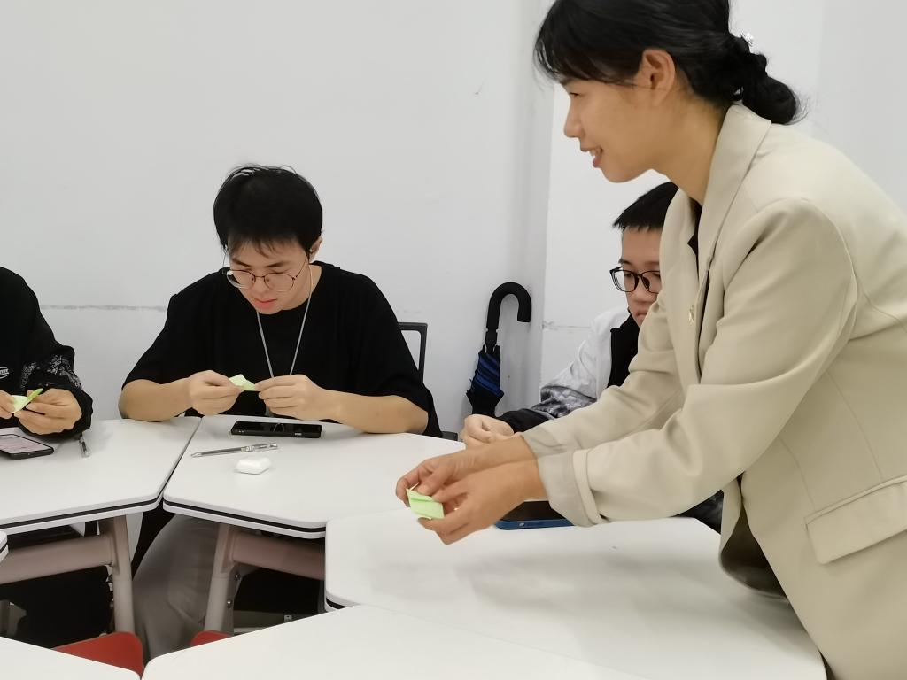 罗曼老师首先向同学们介绍纸鹤的由来和含义,每一只纸鹤都承载着一点祝愿,最终成为一个愿望。同时纸鹤有着美丽的传说和文化底蕴,成为人们的感情寄托。随后罗曼老师让同学们将自己的祝福写在彩色便签纸上,教大家如何折叠,最后再把折好的纸鹤放进盒子里。一只只纸鹤在同学们互相分享的过程中被赋予了独特的意义。