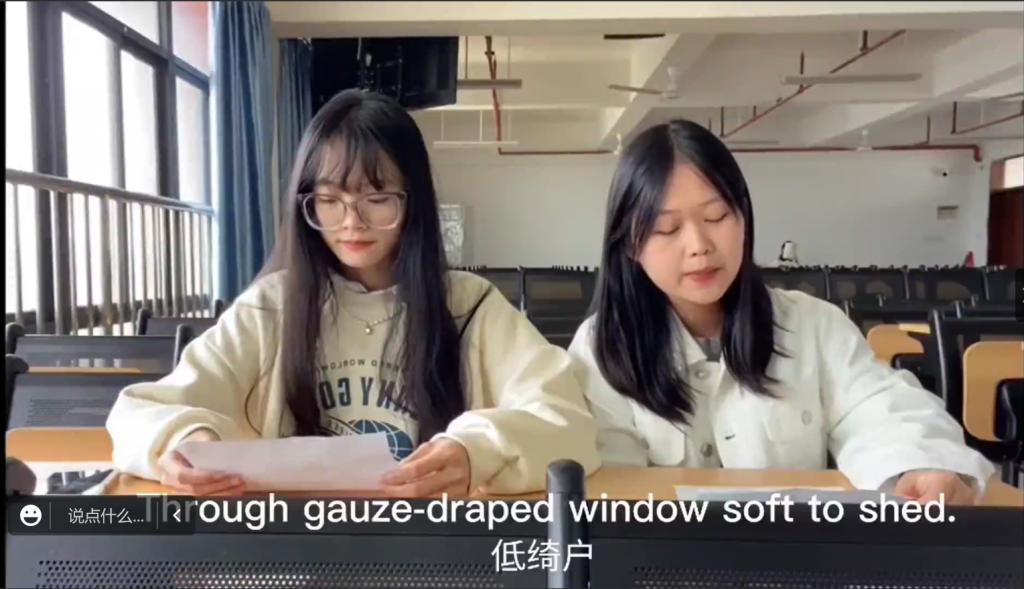 此次诗朗诵活动共有19支参赛队伍,参与者来自20级至22级不同班级。他们分别朗诵了 She Walks in Beauty,I Wonder Lonely as a Cloud,To Autumn,The Road not Taken,The Furthest Distance in the World ,If,To a Stranger,《白桦林》、《将进酒》、《金缕衣》和《再别康桥》等中外作品。伴随着背景音乐,朗诵者们用抑扬顿挫的语调和丰富充沛的情感带领着观众们感受诗歌的魅力。他们通过自己的声音传达自己对于诗歌的理解,不仅增进了同学们对国外诗歌的理解,还用外语传递了中国古现代诗歌的意境美,展现了所学所用的完美结合。