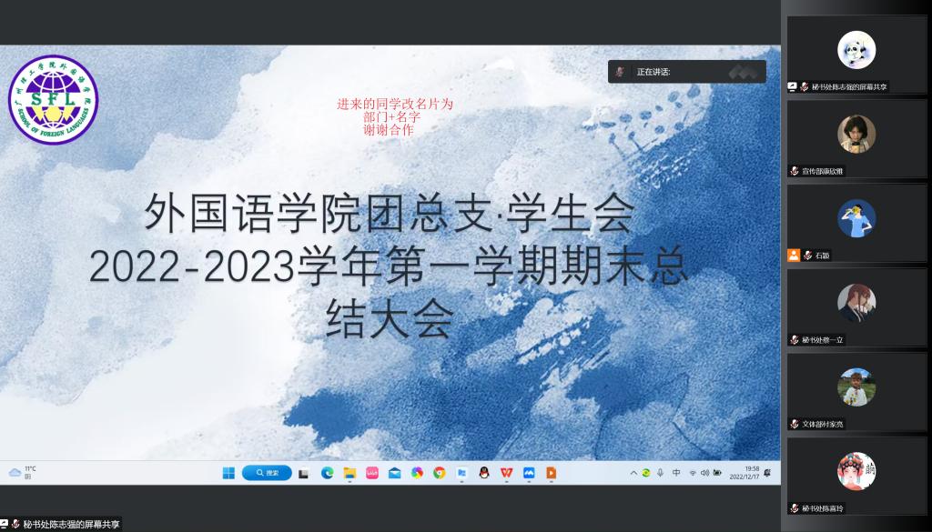 2022年12月17日,我院团总支·学生会于通过腾讯会议召开2022-2023学年第一学期工作总结暨表彰大会,总结本学期工作成果,进一步提升团总支·学生会工作水平。大会由秘书处干事陈志强主持,出席本次大会的有williamhill英国官网团总支书记赵凯老师、团总支副书记兼学生会执行主席戴霖霖、团总支宣传委员兼学生会常务主席陈思洁、团总支文体委员兼学生会常务主席石颖、团总支组织委员梁城彰、文体艺术部部长许静雯和公关实践部部长刘龙达。