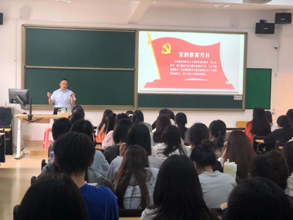 谭家在校长从“国家教育方针及政策内涵”、“明确时代需要什么样的教师”、“认识当前义务教育的现状”和“以选人标准看教师要求”四个方面进行阐述。谭校长在谈到“国家教育方针及政策内涵”方面时,强调了教育的根本任务——立德树人,教育是国之大计、党之大计,并就“三个传播、三个塑造、三个地位”和“家庭、政府、学校、社会四个主体”等方面进行详细讲解。随后他提出新时代教师应具备良好的专业素养和素质及扎实的业务知识与能力。与此同时,谭校长引导同学们正确认识当前义务教育的现状、并就面对新的挑战该如何定位自身教育角色等问题进行深入分析。