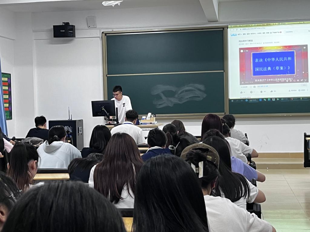 班会伊始,各班班会主持人通过讲解PPT和播放视频讲解了民法典主要内容以及身边行为中可能涉及违法犯罪的一些边缘行为,引导同学们明辨是非,增强自我保护和安全防范意识,树立正确的世界观、人生观和价值观,鼓励他们做学法、知法、懂法、守法的学生。此外,班会主持人介绍了学院转载的中国普法答题文章,引导学生学法、守法、用法、护法,形成尊法信法守法用法的良好风尚。