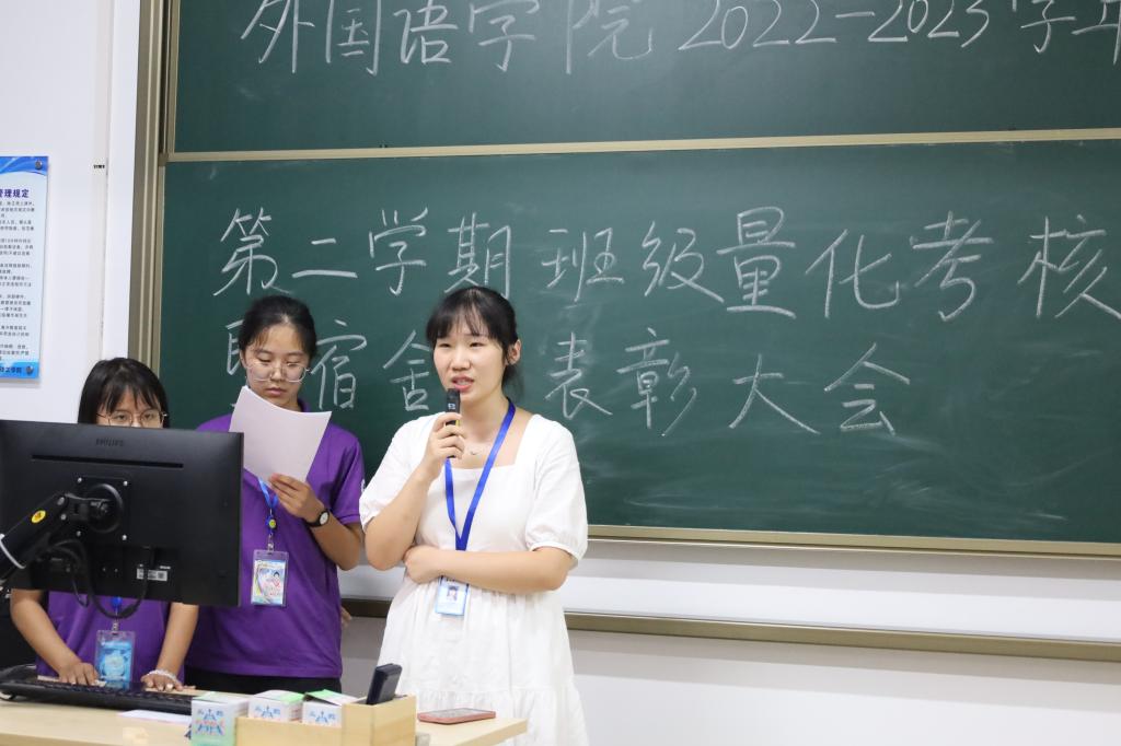 优秀个人包括优秀纪律委员李楚怡,优秀生活委员邓洁,韦叶欣和田渝晴;班级量化考核获奖班级前三名分别是:20英语7班,20英语8班,20英语2班;优秀班级:20英语4班,21英语4班,20翻译班;优秀早读班级:22日语2班;一等奖红旗宿舍班级:20商英1班(0#208),二等奖红旗宿舍班级:22英语1班、22商英1班(4#605);三等奖红旗宿舍班级:21英语7班(32#114)、20英语4班(16A#402)。随后,优秀生活委员代表和红旗宿舍一等奖代表依次上台进行了交流和分享,并就班干部如何严格要求自己提出了相关建议。