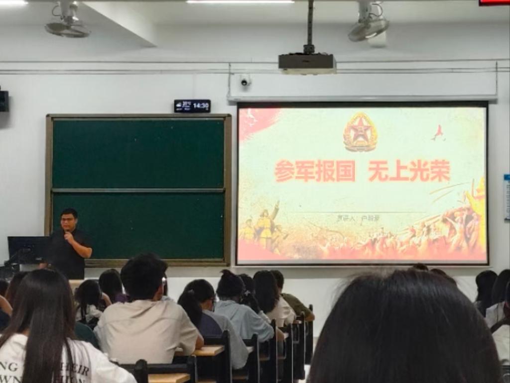 为全面贯彻落实国家征兵政策,激发适龄青年投身国防事业的壮志豪情,培育新时代青年的家国情怀与社会担当,5月14日14:30至15:30,williamhill英国官网在广州校区6-101教室成功举办征兵入伍宣讲会。本次活动由21英语3班退伍大学生卢骏豪与科创部成员柯沅妤担任主讲。外院学子踊跃参与。
