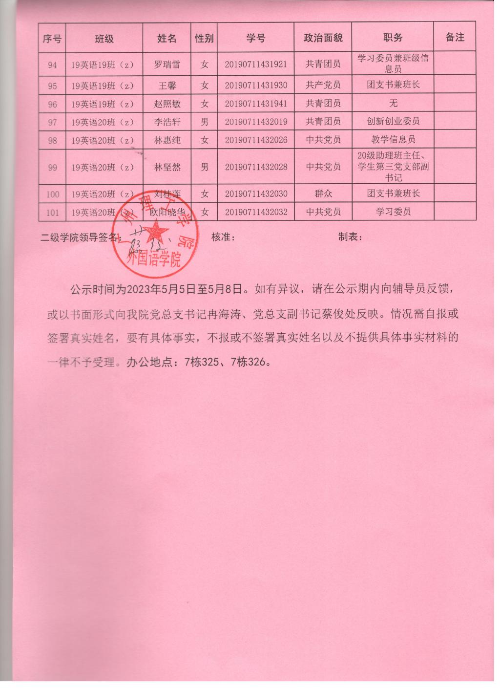 公示时间为2023年5月5日至5月8日。如有异议,请在公示期内向辅导员反馈,或以书面形式向我院党总支书记冉海涛、党总支副书记蔡俊处反映。情况需自报或签署真实姓名,要有具体事实,不报或不签署真实姓名以及不提供具体事实材料的一律不予受理。办公地点:7栋325、7栋326。