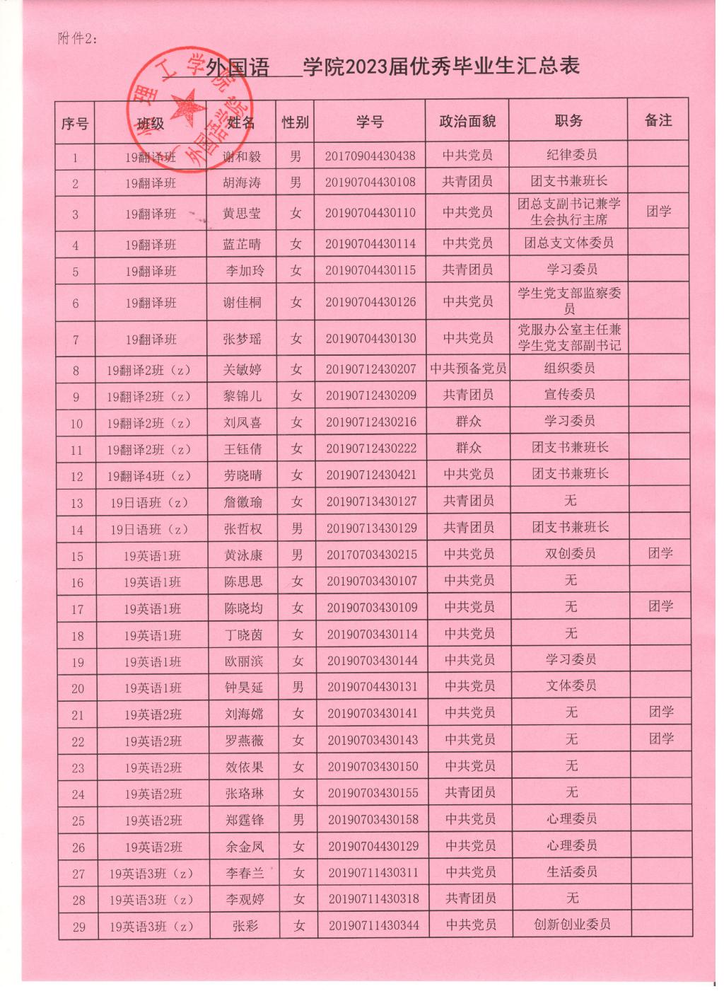 根据我校《学生奖励办法》(广州理工(2022)165号)文件精神及开展评选2023届优秀毕业生工作相关要求,经个人申请、班级评议和学院评选,现将外国语2023届优秀毕业生名单公示如下: