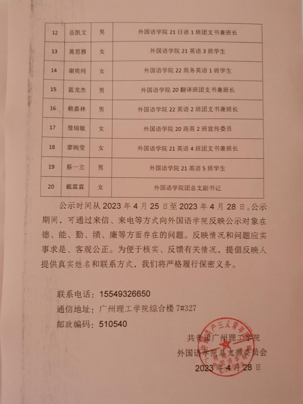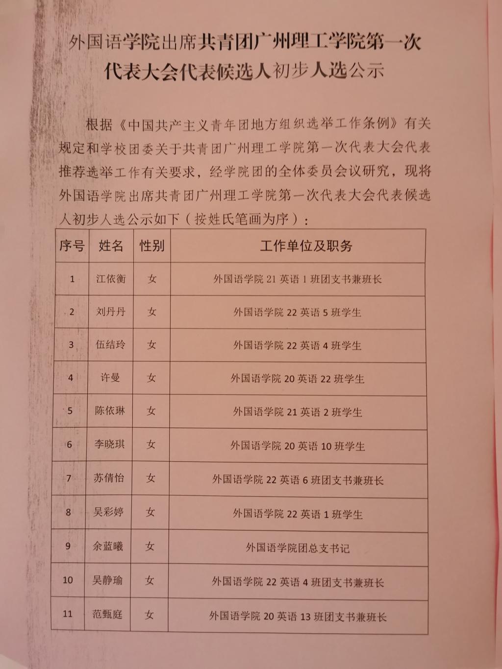williamhill英国官网出席共青团williamhill英国官网第一次代表大会代表候选人初选人公示
