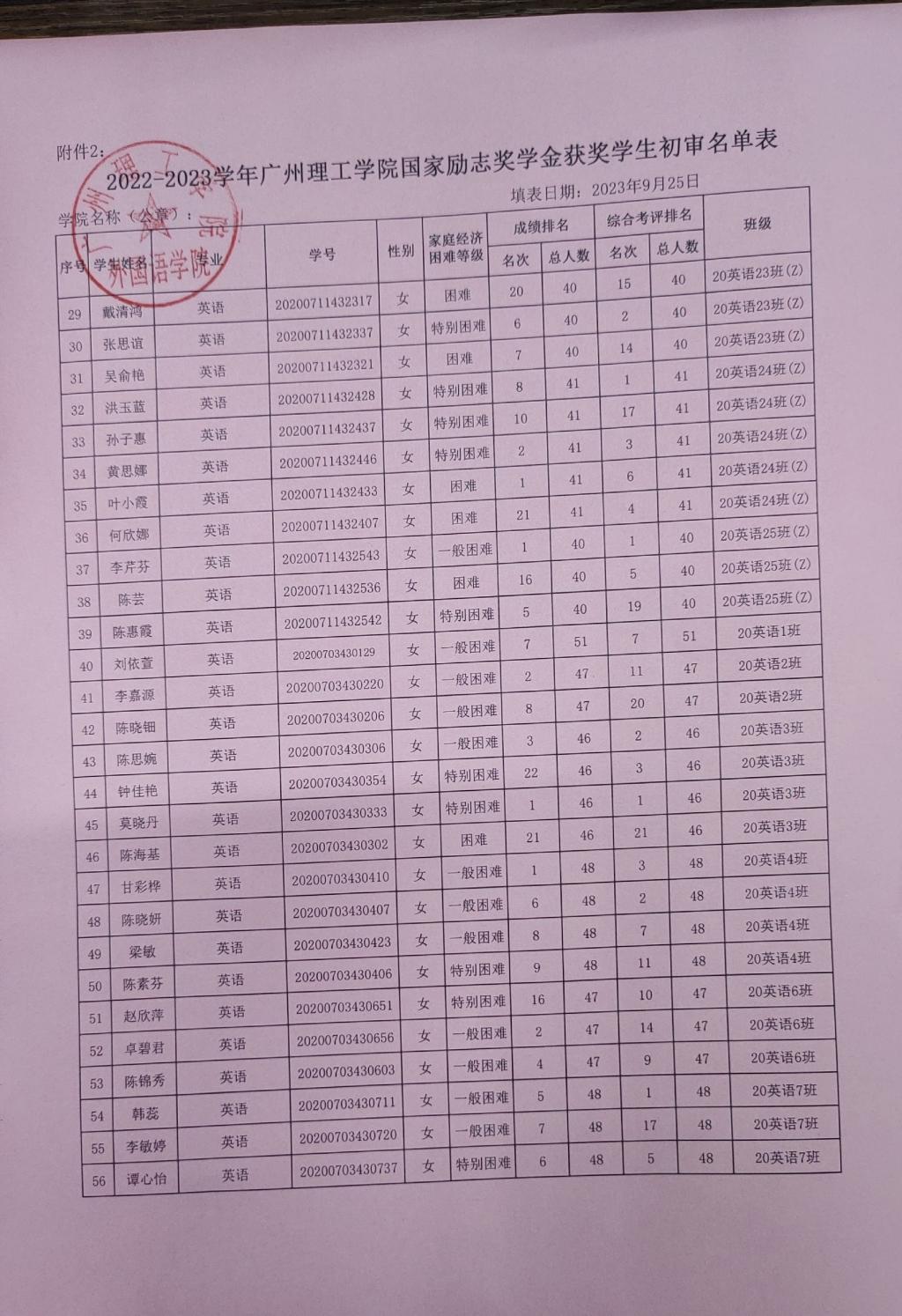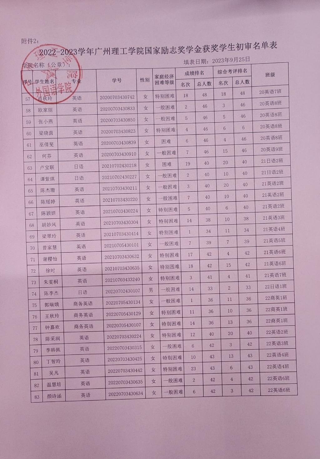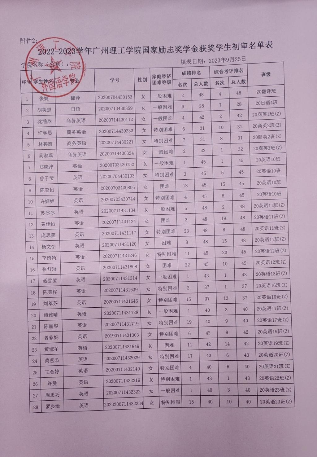 根据学生处《关于开展2022-2023学年国家励志奖学金评选工作通知》(广州理工学助函〔2023〕9号)要求,经学生本人申请以及学院评审小组评定,现将我院2022-2023学年国家励志奖学金获奖学生初审名单予以公示,公示时间为2023年9月25日至2023年9月27日。如对公示有异议,请在公示期内向辅导员老师反馈,或到我院党总支书记冉海涛老师、党总支副书记蔡俊老师处反映,公示期后不再对名单进行变动。