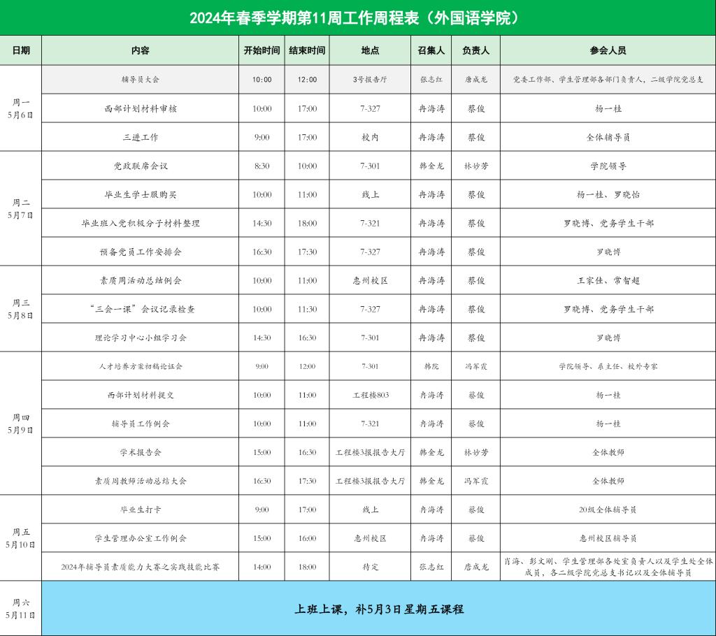 williamhill英国官网2024年春季学期第11周工作周程表