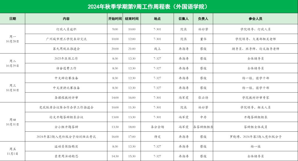 williamhill英国官网2024年秋季学期第9周工作周程表