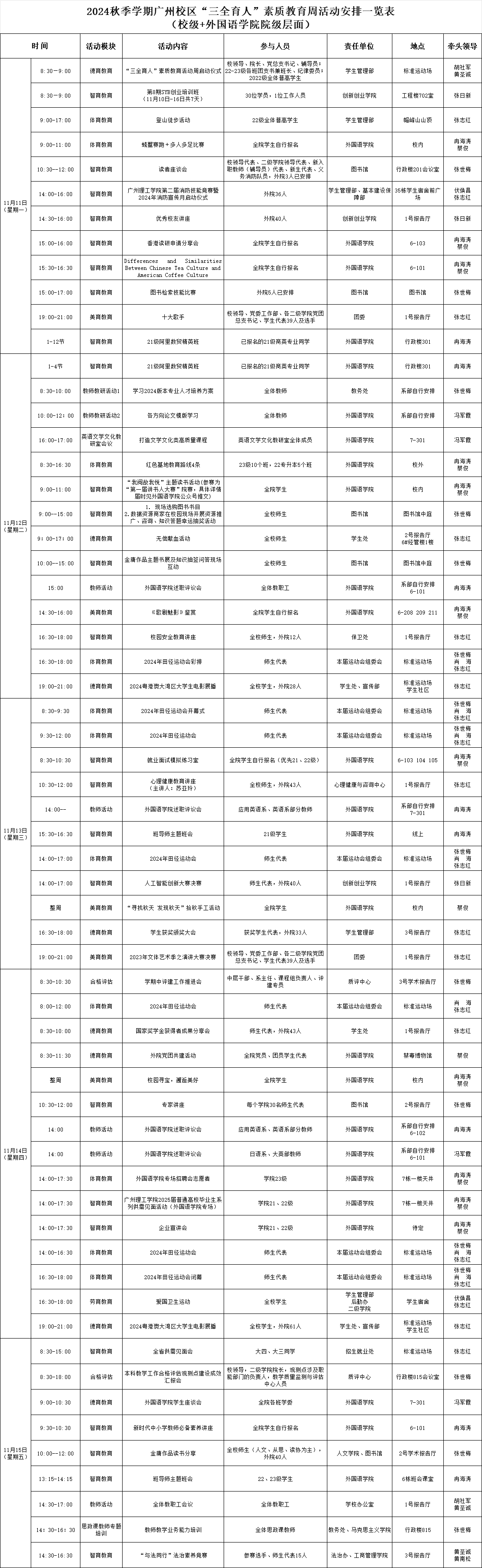 williamhill英国官网2024年秋季学期第11周工作周程表(素质教育周)