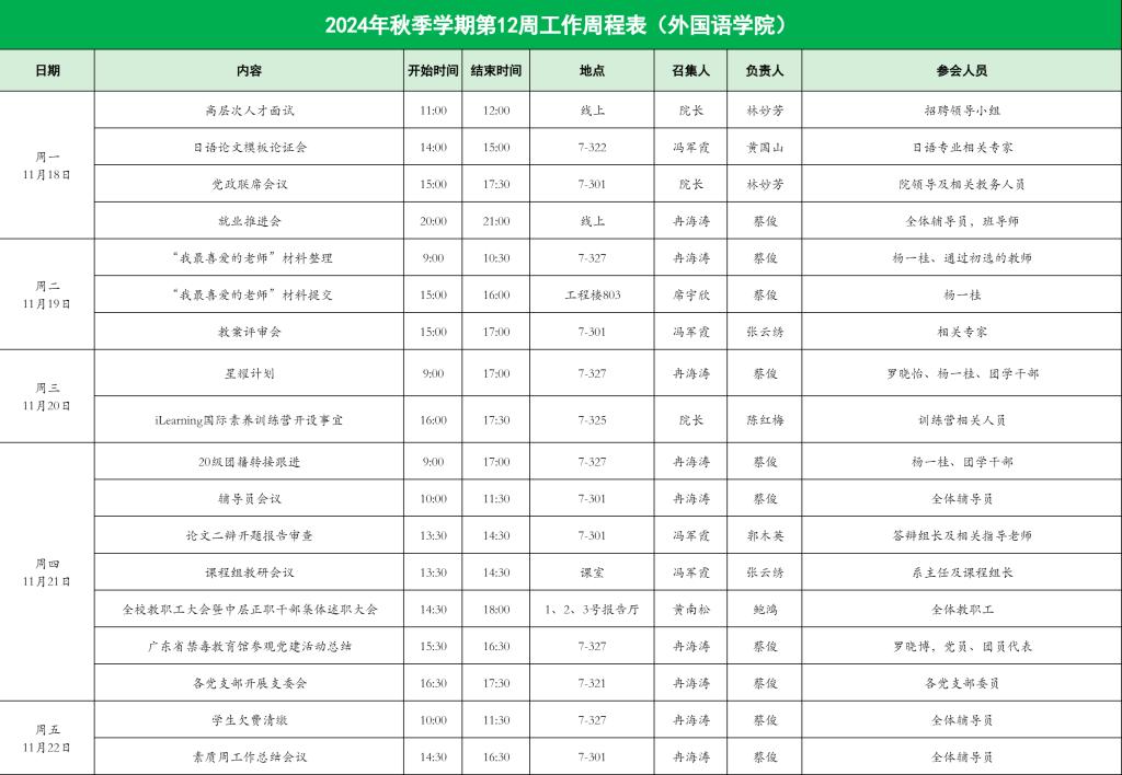 williamhill英国官网2024年秋季学期第12周工作周程表