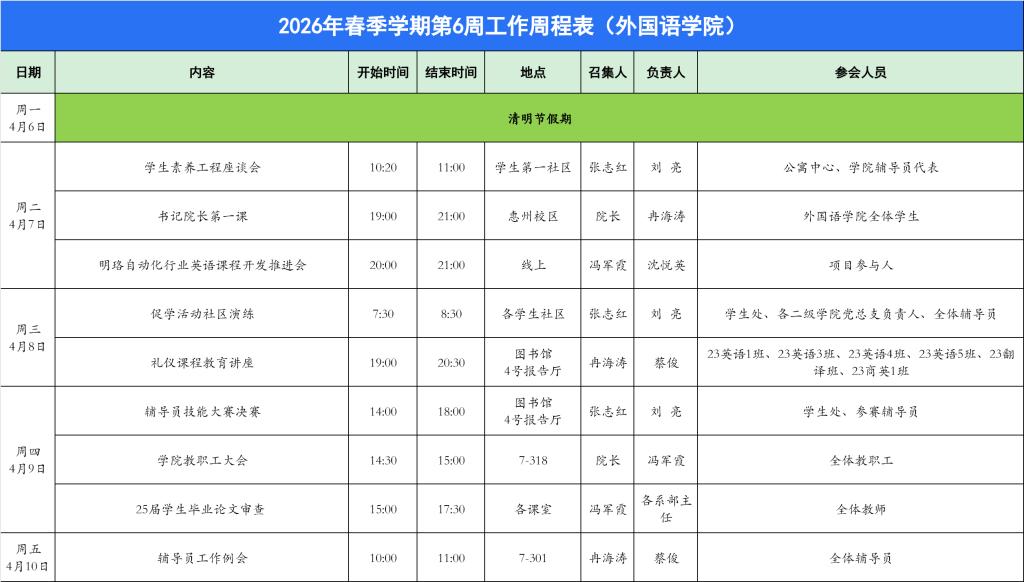 williamhill英国官网2026年春季学期第6周工作周程表