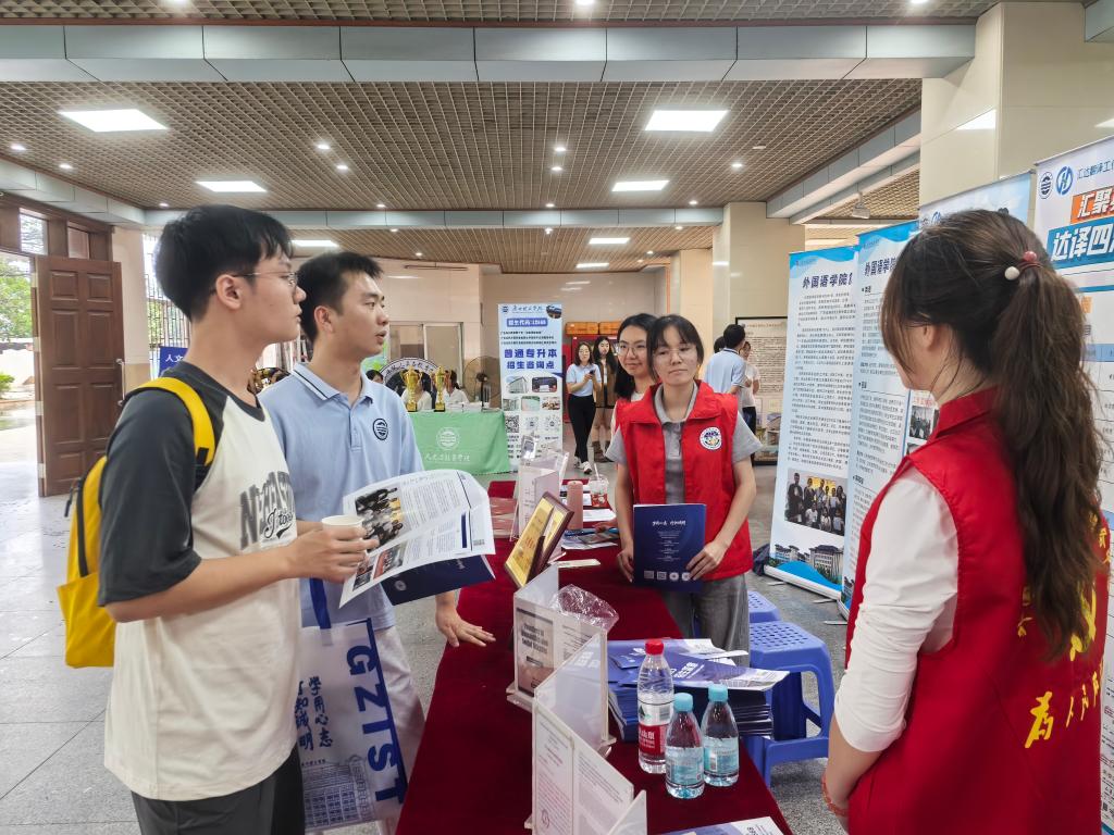 活动当天,志愿者精心布置现场,为学生和家长的到来做好准备。与此同时,韩院长,党总支书记、副院长冉海涛,辅导员罗晓博和关俊文在交流展区热情迎接每一位到来的学生和家长,与其深入交流。活动现场,院领导和辅导员热情地为考生和家长介绍学院专业特色及人才培养方案,为其提供规划指导,并耐心地答疑解惑,帮助其深入了解学科特色与就业前景。就在接待工作有序开展时,党委书记黄圣诚莅临现场指导工作。黄圣诚书记向刚踏入校园的家长和学生致以问候,关切地询问他们对学校的第一印象。在与家长交流过程中,家长表示:“孩子一直对外语很感兴趣,听说今天是开放日,特意带他来看看。”党委书记黄圣诚微笑回应:“williamhill英国官网有着优质的教学资源和丰富的实践平台,相信能助力孩子们在语言学习的道路上茁壮成长。”