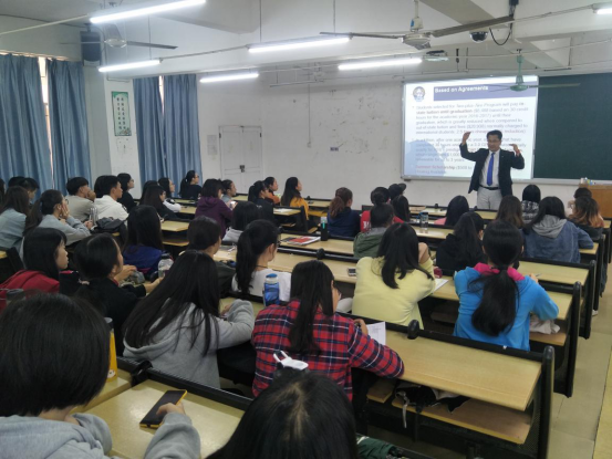 下午,Won-Jae博士在七栋综合楼218举行了了解美国大学教育和文化,熟悉赴美国留学之路的讲座。Won-Jae博士的讲座非常生动,他用全英文演讲为同学们讲解了美国安杰洛州立大学和我校合作的2+2,交换生项目的留学内容,以及相关留学优势,并为同学们解答疑问。讲座生动活泼,同学们听得聚精学习会神。