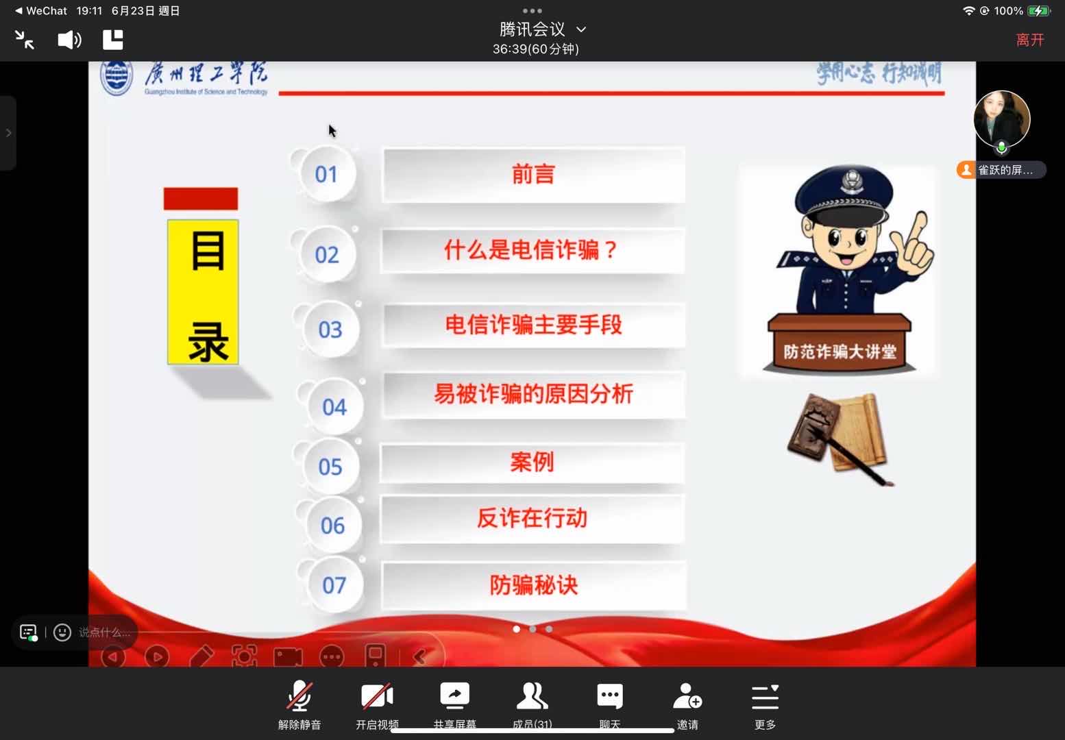 在防诈骗主题班会环节,各班导师针对求职季的相关情况对毕业生进行了就业普法宣传主题教育。班导师们通过实际案例为20级学子开展法律普及教育,提醒同学们远离非法买卖,切勿出租出借“两卡”和网络账号、支付账号等。与此同时,班导师提醒同学们也要警惕脱离现实的“高薪招聘,尤其是境外高薪招聘”,保护自身安全和合法权益。此外,班会主持人还进行了全民反诈的宣传。其从“什么是电信诈骗”、“电信诈骗主要手段”、“易被诈骗的原因分析”、“案例警醒”等相关方面进行了详细介绍。班会主持人讲解了隐藏在大学生生活中的常见骗局,如网络兼职刷单诈骗、虚构中奖、兼职受骗、网上交友诈骗、虚假广告等,帮助同学们掌握识别网络诈骗的技巧。最后,班会主持人提醒同学们在日常生活中要时刻保持警惕,不轻信陌生人,不泄漏个人信息,不随意转账汇款,遇到可疑情况要及时报警并告知家长或老师,下载国家反诈中心APP和保存派出所(020-36088110)及学校保卫处(020-87477210)的电话。同学们应时刻保持警惕,不断提高自我防范意识,避免上当受骗,共同维护安全和稳定。